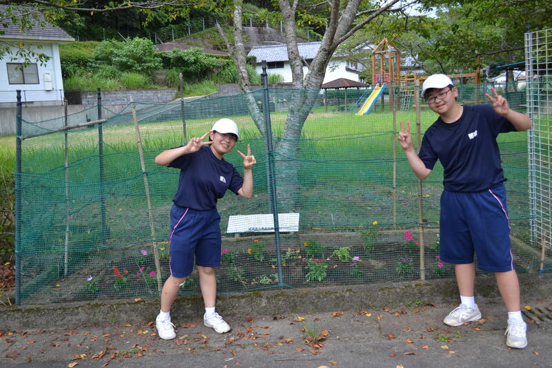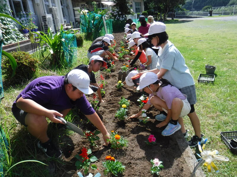 学校だけでなく、お世話になっている地域にもきれいな花を咲かせて、明るく過ごしてもらいたいという願いを込めて植えました。地域の方にもお手伝いをいただいて、見事な花壇に仕上げることができました。