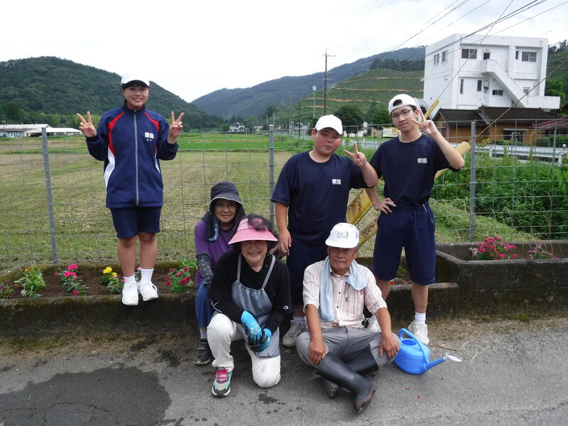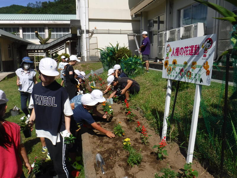 中学部は6つの集会所(大野、妙、鹿狩瀬、佐野、桑平、宮長)に分かれて「人権の花」を植えに行きました。