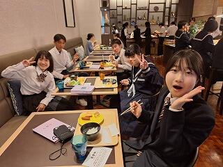 27日(水)の京都は、曇(雨が降らないことを祈ります)ホテルで朝食をとり、地下鉄駅まで歩き、そこから京都へ移動します。下車後は各班分かれての自主研修です。午後、二条城のチェックポイント以外は自由行動です。昼食も各班自由です。計画通り見学地にたどり着けるでしょうか?元気な朝食の様子~自主研修の様子です。