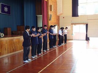 6月1日(土)、2日(日)に行われる地区総合体育大会を前に選手推戴式が行われました。伝統で小学部5・6年生からエールをもらい、決意新たに試合に臨みました。団体戦は男子が3位で県大会出場を惜しくも逃しましたが、個人戦では3年生西田匠君が3位となり県大会に出場します。個人戦準決勝に出場した西田君は、相手の攻撃をことごとく拾い、得点につなげる粘りの卓球でした。保護者・卒業生もたくさん駆けつけ、大声援の中よく頑張りました。1年生は初めての大会で決意表明も大会も緊張したと思いますが、課題の見つかった大会となったようです。4日から少し淋しい部活動になりましたが、2年生を中心に秋の大会での好成績につなげてほしいです。