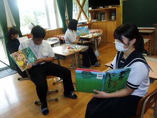 7月16日(火)昼休みに中学生が小学部棟に行って、読み聞かせを行いました。今回が第1回目で、先日延岡市立図書館の方から教えていただいたコツを思い出しながら、低・中・高学年に分かれて活動をしました。読む側は勿論聞く側も真剣な態度でした。暑くて外で思いっきり遊べない小学生には丁度良かったかもしれませんね。