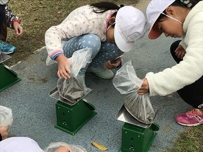 1組は、4時間目に「1Kgってどれぐらい?」という課題で、ビニル袋に目印をつけさせ、運動場の砂場で砂を入れて重さを量りました。いざ量ってみると軽すぎたり、重すぎたりと予想との違いに子どもたちは、びっくりしていました。