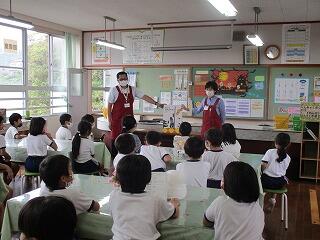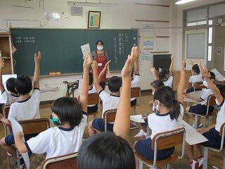 全学年、図書の並べ方や本の取り扱いについてクイズ形式やグループ学習で教えていただきました。専門的な立場からのお話は、子どもたちにとっても新鮮で、特に、大型本の読み聞かせでは、「わぁ~~。」の声が聞こえるほど喜ぶ様子が見られました。これからの本の借り方や返し方に生かしてほしいですね。