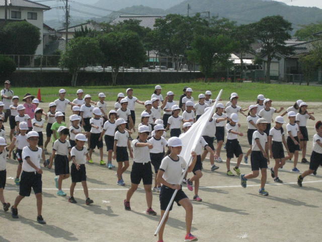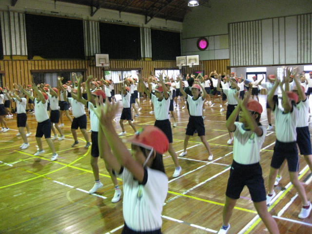最後の全校体育を行いました。入場行進・閉会式の練習を行いました。その後、全校ダンスの「ばんば踊り」の練習を行いました。