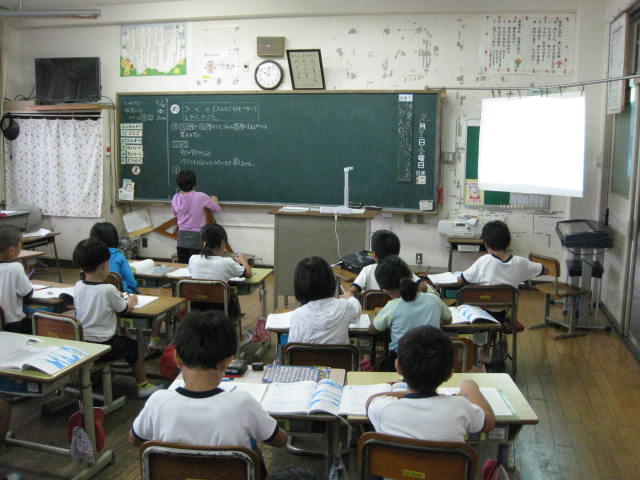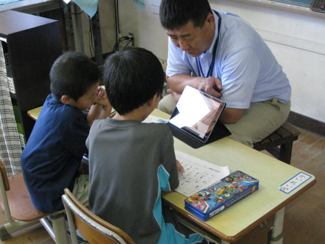 2組は、音楽の一教諭と担任の佐藤教諭の2名で算数の学習に取り組んでいるところでした。3年生は、基本算数の時間は2名の教師ですすめるようにしています。