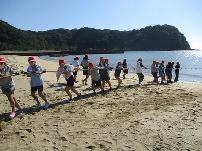 5年生は、ひむか感動体験ワールドのご支援を受けて、須美江ビーチで地引き網体験をさせていただきました。みんなで力を合わせて地引き網の綱を引くと、鯛や太刀魚など様々な魚があがり、みんなで大歓声でした。獲った魚で血抜きの仕方や絞め方を見せていただき、昼食には、民宿紺碧のご協力でとっても美味しい味噌汁やフライをごちそうになりました。ご支援、ご協力いただきました皆さん、素敵な体験をありがとうございました!