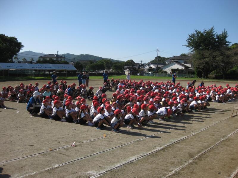 全校児童が運動場に揃いました。まだ全員帽子の色は赤のままです。