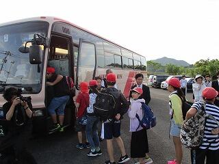 朝7時に、にこにこ顔の子ども達が出発式がある海浜公園に集まってきました。2日間お世話になる運転手さん、ガイドさん、添乗員さん、写真屋さんの紹介があり、代表の児童が立派な挨拶をしてくれました。一人の欠席者もなく天気にも恵まれました。2日間元気ですてきな思い出を作ってきてほしいと思います。