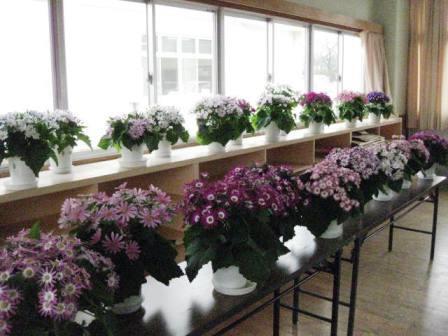 卒業まで残り8日となりました。卒業式に必要な花を一人一鉢運動ということで全校児童で育てています。