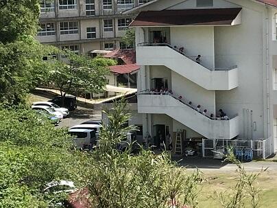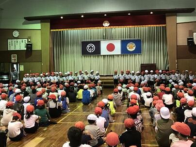 昨年度、非常用避難階段が混雑した経緯があり今回3・5年生が南門を使っての避難をしました。今回の避難は合図から7分30秒で完了しました。南海トラフの地震想定だと17分で津波が到達します。校舎内部や非常用避難階段が崩れていたらなどと考えますと、ぎりぎりに近いです。次回は、もっと短時間で避難できるとようにしたいものです。