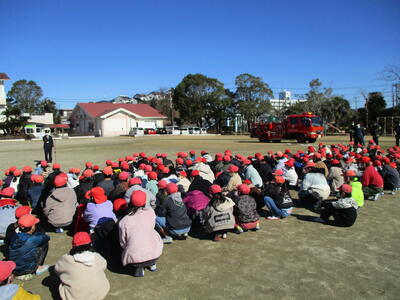 避難後には、延岡市消防本部・南分署よりお越しいただいた消防隊員の方より、火事や避難についてのお話をしていただきました。