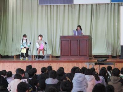 代表児童3名が「2学期の振り返り」を発表しました。全校児童の前で堂々と発表する姿は素晴らしかったです。また、振り返りをもとに目標をもつことで3学期からも頑張ろうとする意欲が感じられました。