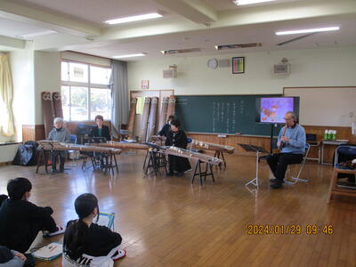 1月29日(月)、6年生の2学級で筝と尺八の音楽鑑賞の授業を行いました。演奏者の方々をお招きし、語りに合わせた「かさじぞう」の曲や「花は咲く」「春の海」といった耳馴染みのある曲の演奏を聴かせていただきました。子ども達も、3面の筝のハーモニーと尺八の音色に聞き入っていました。
