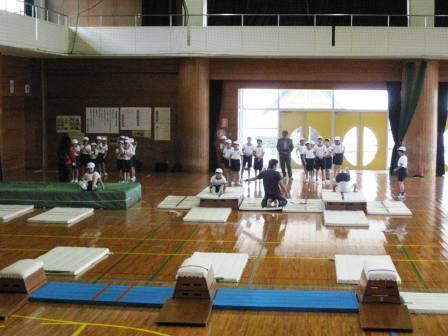 今回は、伊形小学校の3年生に跳び箱の「台上前転」という技を指導する授業でした。