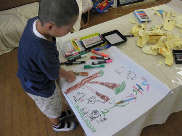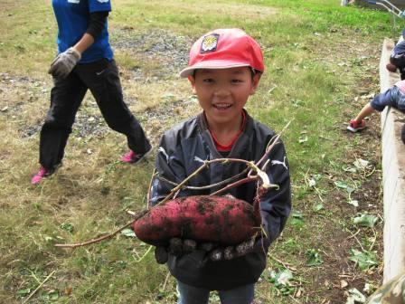 収穫したお芋を絵にしよう。2の1 大きくお芋をかきましょう。でも、何故おいもだけかくのでしょうか。実はこの後に、いもほりをし楽しいなという自分姿を書いていくのです。自分から先に書くと、どうしてもお芋は小さく小さくなってしまいます。