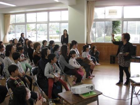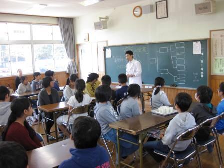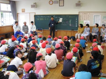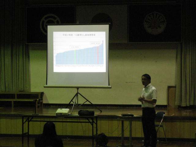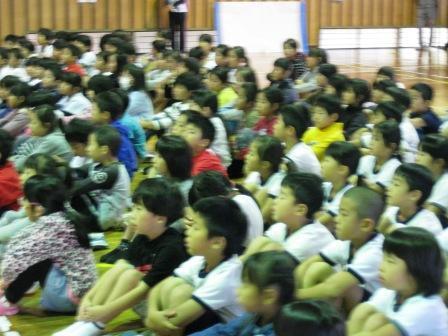 下学年(1年・2年・3年)の児童が対象でした。お話の中で、今の自分たちの下の歯は何本あるか数えてごらんと言われました。早速、子どもたちは向かい合って数えていました。だいたい10本~12本ぐらいの歯があるのだそうです。その歯にミュータンス菌のつくる酸がつくとむし歯になっていくのだそうです。毎日のブラッシングだけではなかなか落ちないの特長だとか。