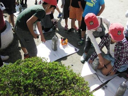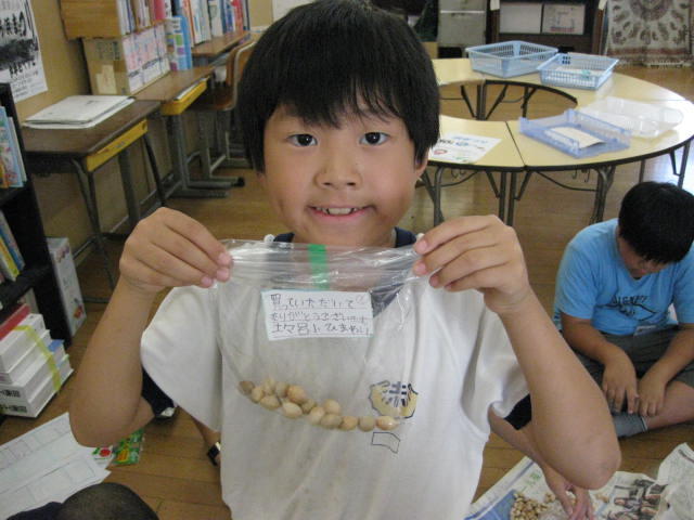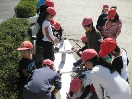 1組は、4時間目に「1Kgってどれぐらい?」という課題で、ビニル袋に目印をつけさせ、運動場の砂場で砂を入れて重さを量りました。いざ量ってみると軽すぎたり、重すぎたりと予想との違いに子どもたちは、びっくりしていました。