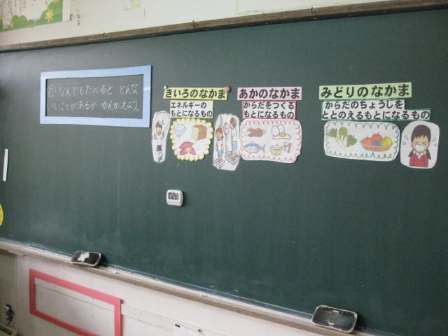 1の2 道徳の授業 さし絵や発問カードを準備しての授業です。どこにどの絵を貼って、児童の発表をどこに書いていくのかを事前に考えてあるので、まとまりのある黒板になるのです。