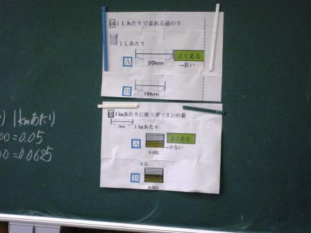 黒板の白い2枚のボードは手作りのホワイトボードです。児童に自分の考え方や計算方法を書かせるときに使います。代表的な2つの考えが出されたあとに、他の児童が他に考え方があると発言し、その考え方をていねいに聞いているところです。児童は、なかなかすらすらとは説明できないのですが、教師も丁寧に聞き取ろうとしていましたし、他の児童も発表する児童の内容に耳を傾けていました。