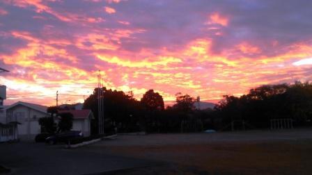 今朝、学校に着いて東の空を見ると、朝日が出る前の雲の色がなんともいえない色に染まっていました。