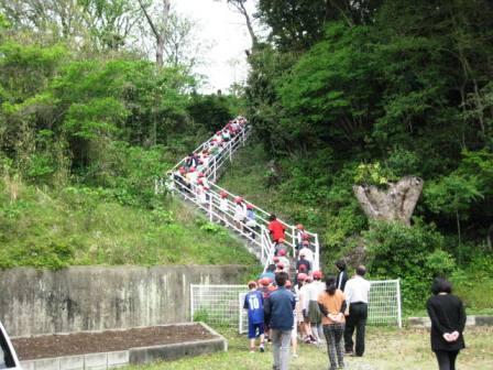 登校の様子を見るために、海咲ヒルズの方に行ってみました。丘の上から霧島台を抜けて極楽寺の坂まで出る階段を下りていきました。そこで撮影したのが下の写真です。 階段には手すりがありますが、前方の平らになっている部分には柵もありません。幅は1m以上あり、歩けるのですが、崖から落ちる危険があります。絶対にこの部分に行かないように学校でも指導をします。ご家庭でもご指導をお願いします