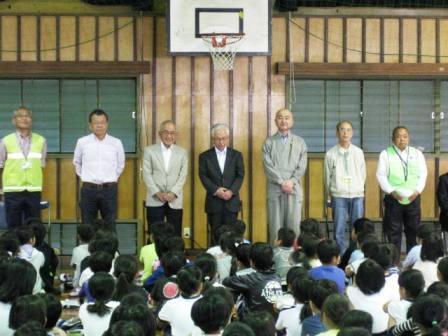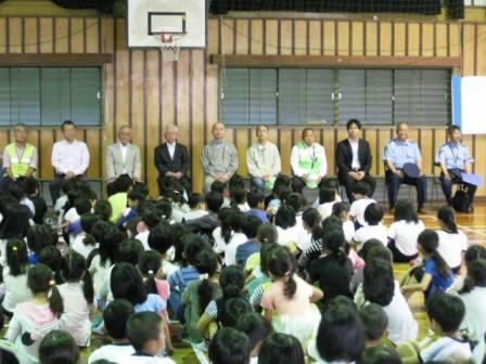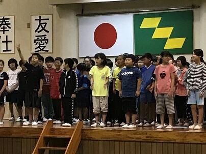 全校朝会が行われました。チャイム黙想のきまりをきちんと守っています。