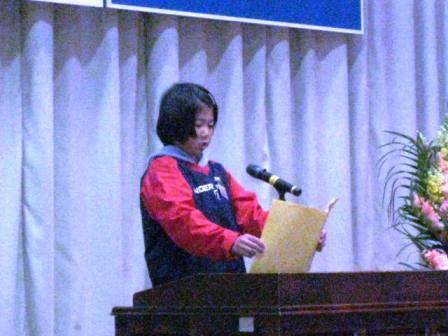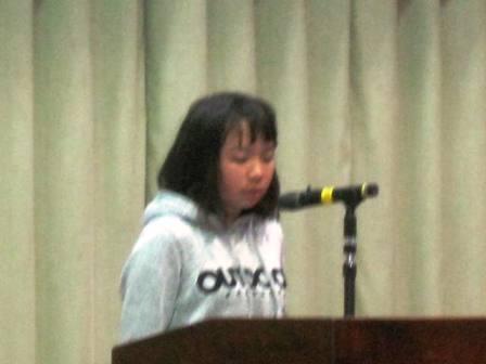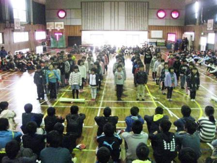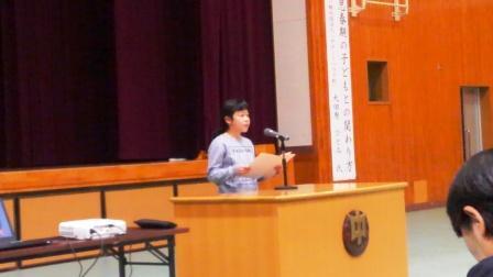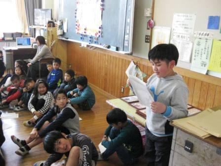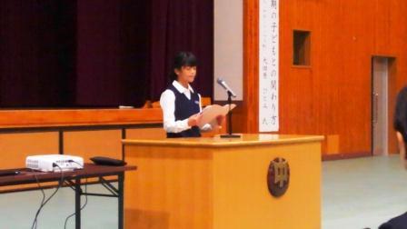 6年生(卒業生)のいない体育館は、何だか広く見えて寂しさを感じました。その後、3年生と1年生の代表児童に作文を発表してもらいました。