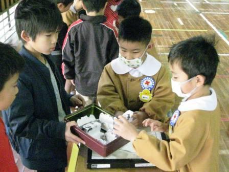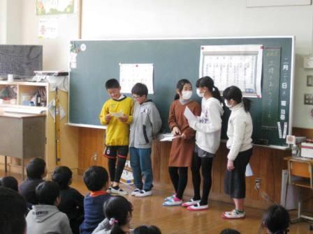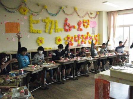 今日の給食には「ケーキ」がついていました。明日は6年生の卒業式です。小学校最後の給食をみんなで輪になって食べていました。土々呂種学校に進学する人は、この学校で作る給食を食べられますが、その他の学校に進学する人にとっては最後の給食となります。