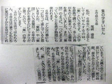 今回掲載された5年生の尾崎優奈さんは、今年2回目の掲載となりました。今回の内容は卒業生に贈る一文字について、その文字に込めた思いを綴っています。