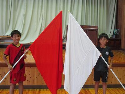 9月19日(木)朝の時間に5・6年生が体育館に集まり、運動会の団の色を決める「結団式」が行われました。暑さ対策もあり、この様子をリアルタイムで各学級に配信して全校児童で視聴しました。
