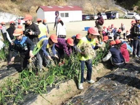 今日は「JAのべおか」の方々にお越しいただいて、玉ネギの収穫を三年生が行いました。