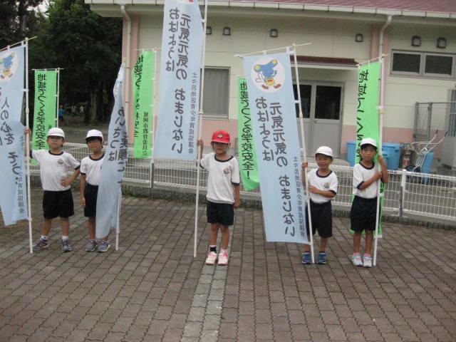 今日のあいさつ運動の当番を1年1組の児童でした。自分の体より大きなあいさつ運動の旗をもって、元気な声であいさつをしていました。