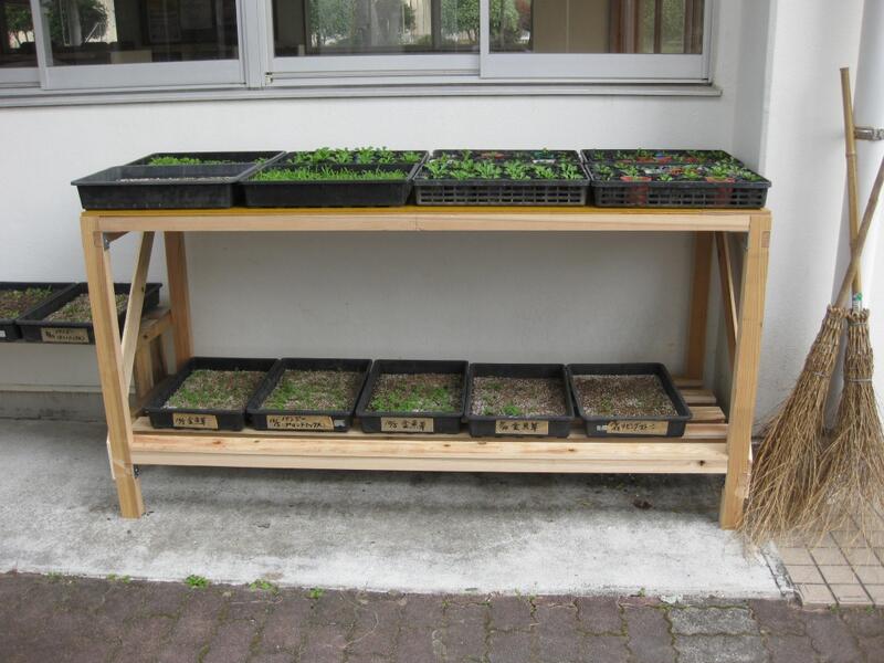 写真の棚は、金丸学校技術員が卒業式に飾る花の苗を育てるために作った棚です。