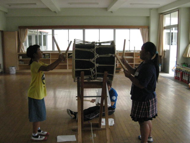 最初は、全校ダンスの「ばんばおどり」の太鼓の練習に取り組む6年生です。曲を流しながらそれに合わせて太鼓を打っていました。全体を揃える役割があるので、真剣な練習が続いていました。