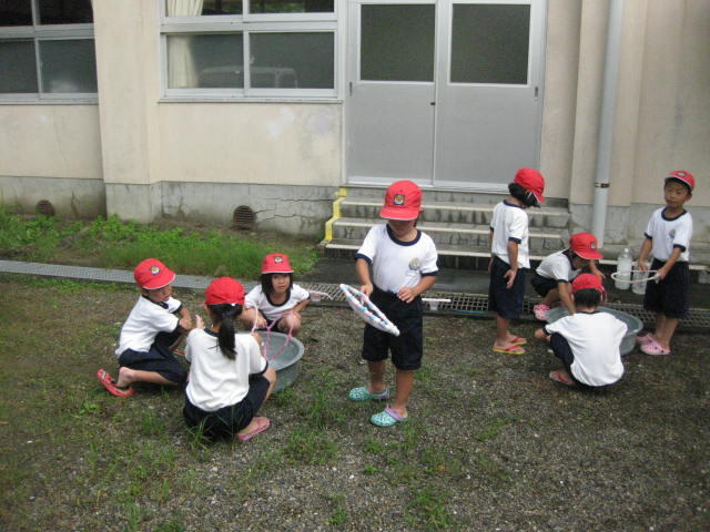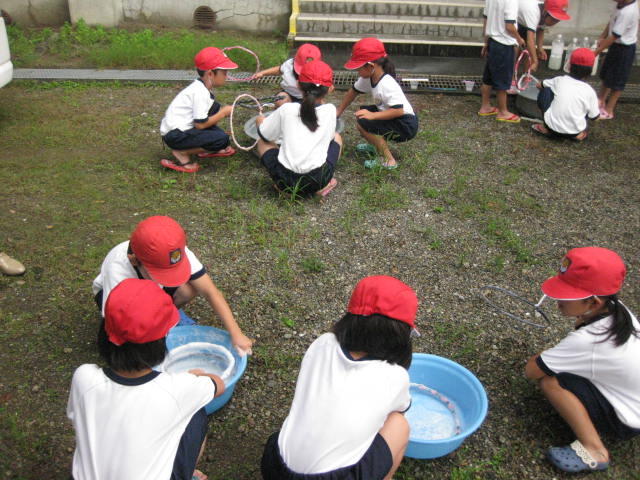 1年生が「生活科」の授業で、シャボン玉つくりをしました。おおきな輪っかを使って、たらいの中の石けん水をよくつけてから大きなシャボン玉を作ろう挑戦していました。