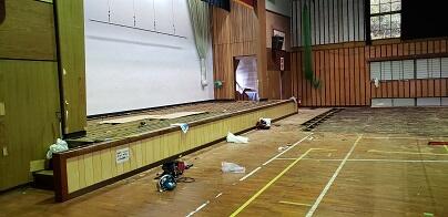 今週(11月12日)より体育館の床の工事が始まりました。今は床面をはがす作業が進められています。ステージの上も床板がきれいにはがされていました。