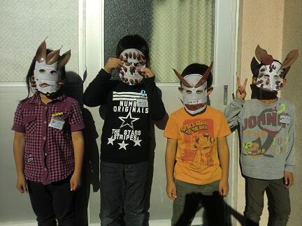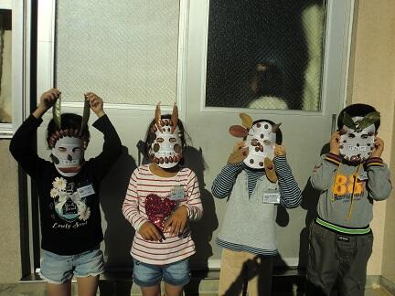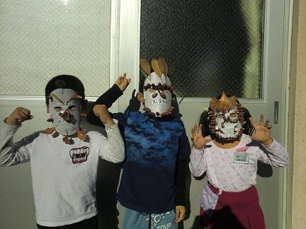 1年生が、11月6日に拾ってきたドングリや木の葉を使って、すてきなお面を作りました。おもしろいもの、たのしいもの、かっこいいもの・・・・いろいろ出来上がりました。お面をかぶってポーズ!!
