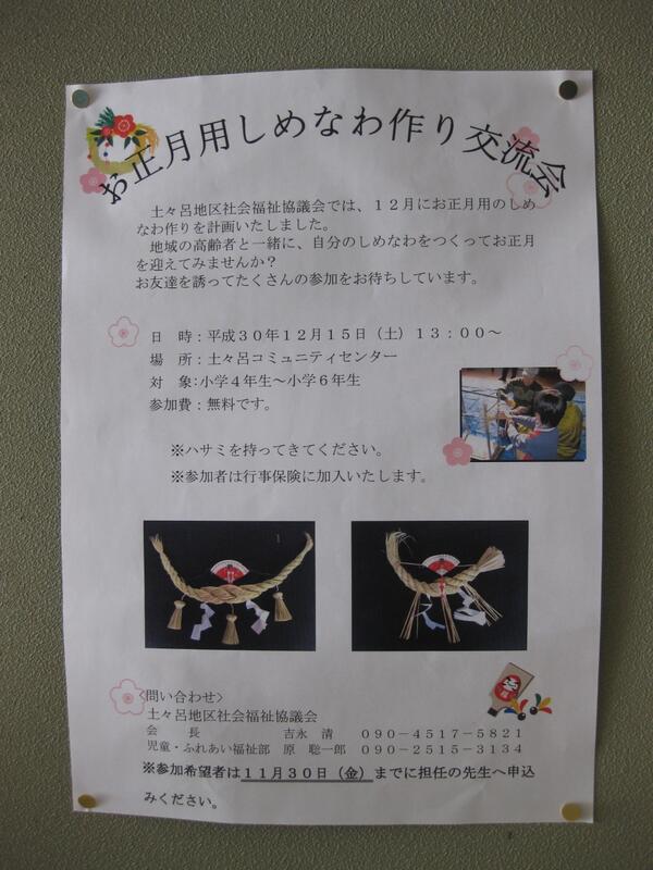 毎年 土々呂地区社会福祉協議会主催のしめ縄づくりが、トトロ地区コミュニティーセンターで開催されています。