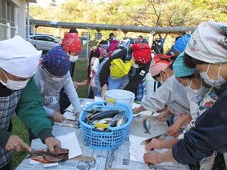 地元の漁協から350匹のサバを提供していただき、婦人部の方々にさばきかた、開き方をていねいに教えていただきました。
