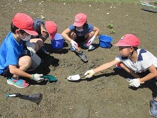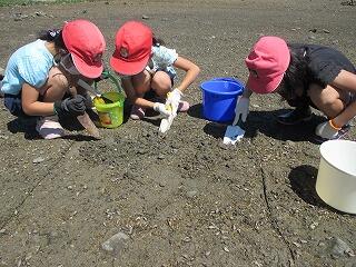 干潟の砂を掘ってみると、大きなハマグリやアサリ、カニなどがたくさん出てきて子どもたちは大喜びでした。場所によって、生き物の数が変わるのは、栄養分が十分かどうかに関わってくるということなどを体験を通して学びました。