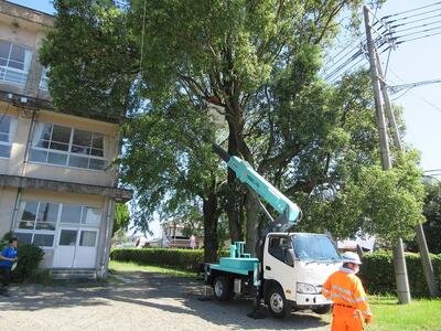 日差しの強い日でしたが、高所作業車などを使い、手際よく迅速に、そして見事に綺麗に剪定していただきました。地域に貢献する企業を目指しておられるということでしたが、地域にこういう素晴らしい企業があるということに心から感謝する次第です。作業に当たっていただきました皆様、本当にありがとうございました。