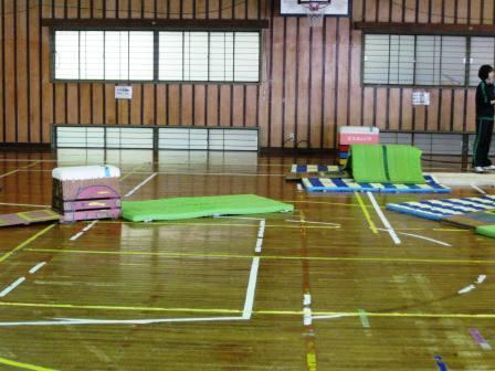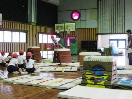 写真を見てもらうと分かるように、手前の方の跳び箱の方が低くて、奥の跳び箱が一番高くなっています。どの場所で練習するか自分で判断し挑戦していきます。そのとき大事になるのが、ポイントとなる点の指導です。ここをきちんとしたあとで練習にはいります。