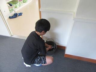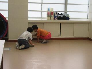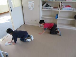 みんなでデッキブラシを使って一生けんめい床を磨きました。