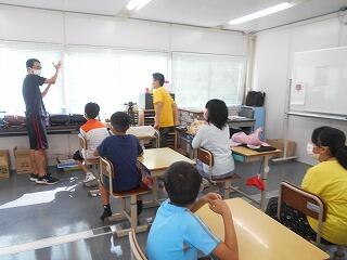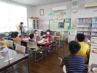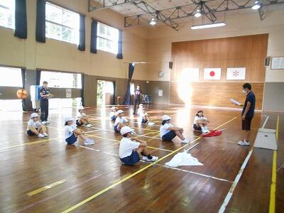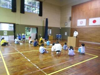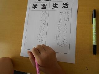 続いて、夏休みの自立貢献についての話を聞きました。それは、4つの目標(チャレンジ・記録・お手伝い・健康)です。頷きながら真剣に話を聴く姿が見られました。