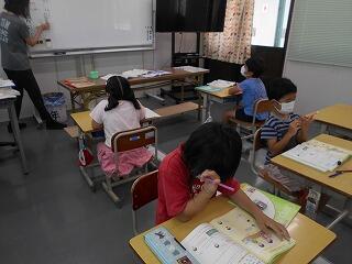 2学期も3日目。プレハブ教室での学校生活にも馴染み、集中して学習に取り組む姿がたくさん見られます。