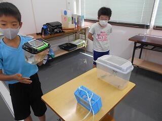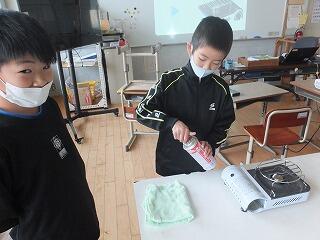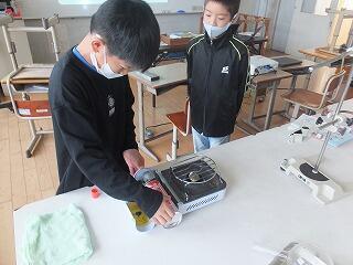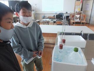 まず、前回の「空気の温度による体積の変化」の実験の復習で、2つの実験をしました。