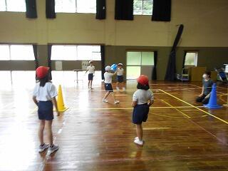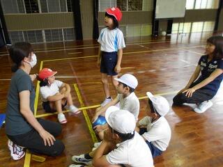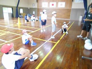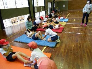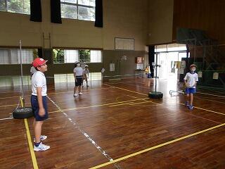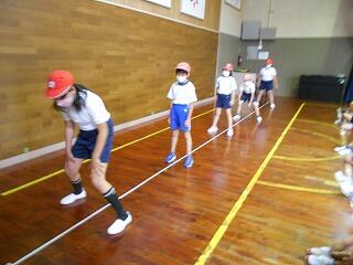 5月30日(月)、雨なので、体育館での体育です。今日は「跳」の運動。