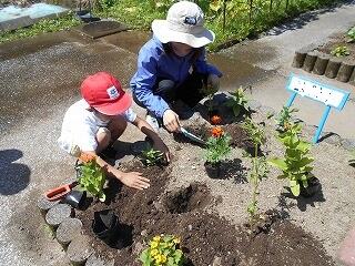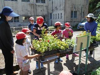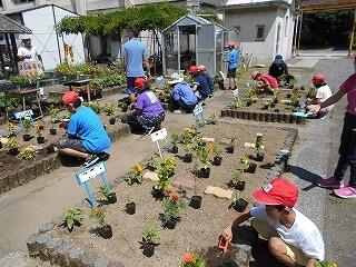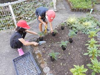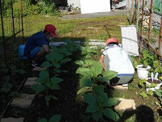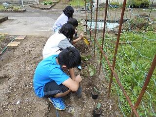 理科で栽培している植物が大きくなってきたので、ビニールポッドから花壇へ植え替えました。
