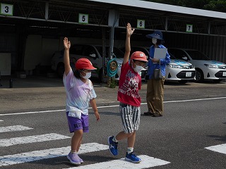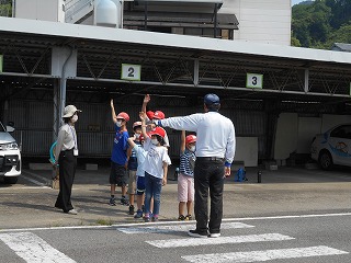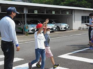 学校に帰ってきて、早速、復習です! みんな上手に、手を挙げて安全確認、そして、安全を確認しながら横断!