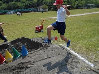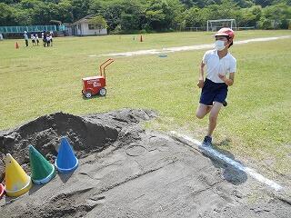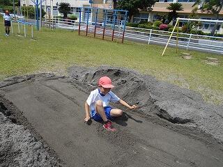 新しく砂を入れてもらったばかりの砂場にできた走り幅跳び練習場では、走り幅跳びに、チャレンジする子どもたちの姿が何度も見られました。